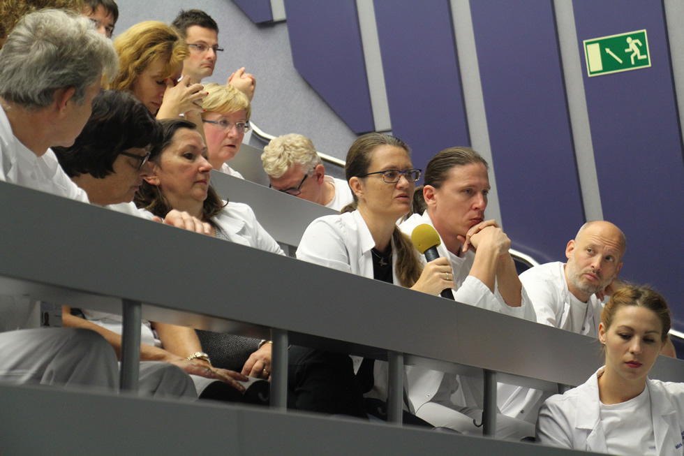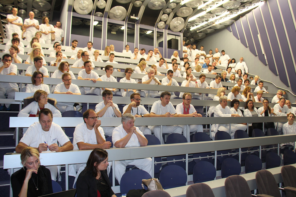 V četrtek, 27. oktobra, je v nabito polni predavalnici v Univerzitetnem kliničnem centru v Ljubljani potekal zbor zdravnikov in zobozdravnikov, na katerem so razpravljali o napovedani zdravniški stavki, ki se bo začela v torek, 8. novembra 2016 ob 7. uri.