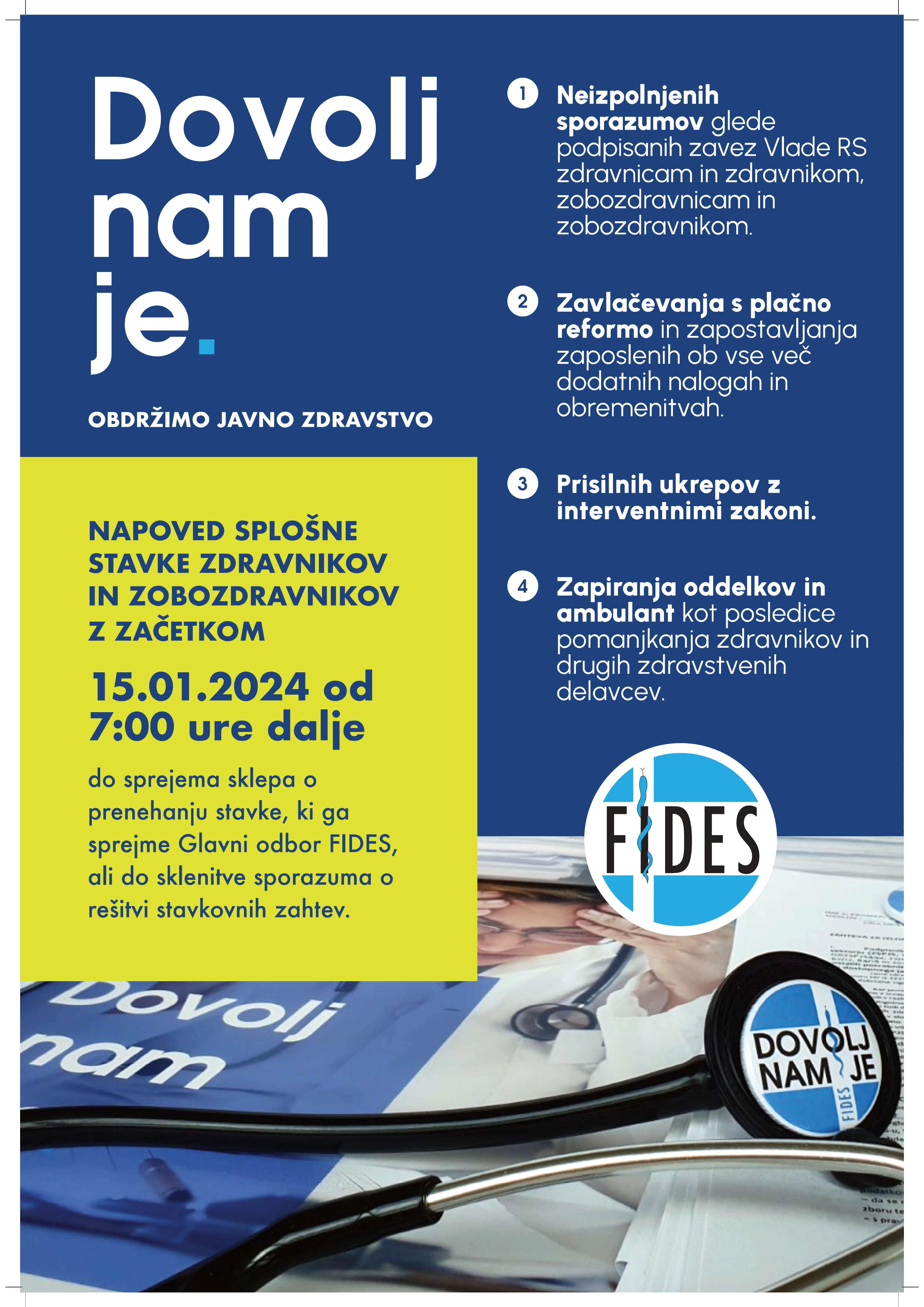 Zdravniki in zobozdravniki bodo jutri ob sedmih zjutraj pričeli stavkati do preklica. »Stavkati si ne želimo. Je skrajni ukrep za katerega nosi odgovornost vlada, ki ni uresničila podpisanih in na vladi potrjenih zavez,« pojasnjuje Damjan Polh, predsednik sindikata FIDES. V sindikatu ugotavljajo, da je iz s strani Vlade prejetega predloga jasno razvidno, da ne vodi k uveljaviti njenih dogovorjenih in podpisanih zavez iz oktobra 2022 in januarja 2023. Ocenjujejo tudi, da je ravnanje vlade sprenevedanje v škodo pacientom, ki vodi v še hitrejšo razgradnjo javnega zdravstva.